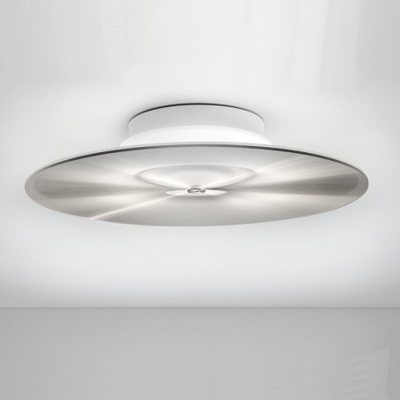 CINI&NILS - Fludd è una lampada da soffitto per interni a luce diffusa, dimmerabile Un disco trasparente con mini-prismature antiabbaglianti, rifrange la luce emessa dall’elemento diffondente superiore e la concentra verso il basso. La luce di Fludd, un led da 30w 2800°K 3800lm, diffusa e schermata rende la lampada adatta per installazioni in diversi contesti d'arredo. L’alto Indice di Resa Cromatica (CRI) garantisce il rispetto della percezione dei colori e la corretta illuminazione dell’ambiente.