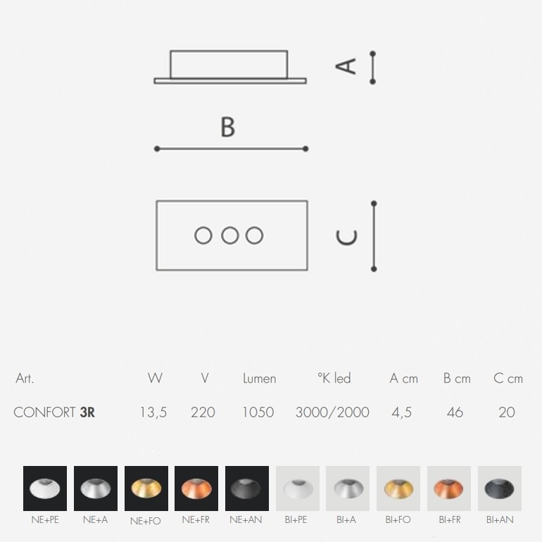 ICONE – Confort R è una lampada da soffitto con corpo/diffusore in alluminio di forma rettangolare e solo 4,5 cm di sporgenza dal soffitto. Disponibili in differenti combinazioni cromatiche di colore, con possibilità di scelta per quanto riguarda le dimensioni e di conseguenza numero di sorgenti Led, ciascuna con una potenza di 4,5w 3000K 350lm. Una lampada dalla linea essenziale, quasi impercettibile, adatta per illuminare con discrezione gli ambienti più disparati. Difatti grazie alle differenti versioni e quantità di sorgenti luminose di cui sono dotate, è possibile illuminare dai piccoli spazi come disimpegni, corridoi, bagni, ingressi e scale come pure ambienti più ampi e importanti come sale , soggiorni, camere da letto, camerette e cucine.