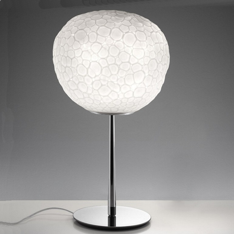 ARTEMIDE - Meteorite 35 tavolo stelo è caratterizzata da un diffusore in vetro soffiato e un corpo lampada in polimero tecnico, alluminio e acciaio. La particolarità che contraddistingue questa lampada è il diffusore, realizzato in vetro artistico a doppio strato, ottenuto con la tecnica artigianale della soffiatura in stampo a fermo e la conseguente molatura. Le lampadine utilizzabili possono essere di tipo alogeno da 150w o LED 21W dimmerabili con attacco E27 escluse.
