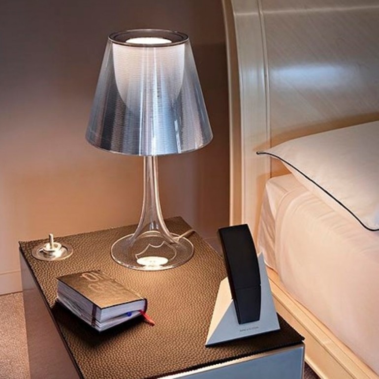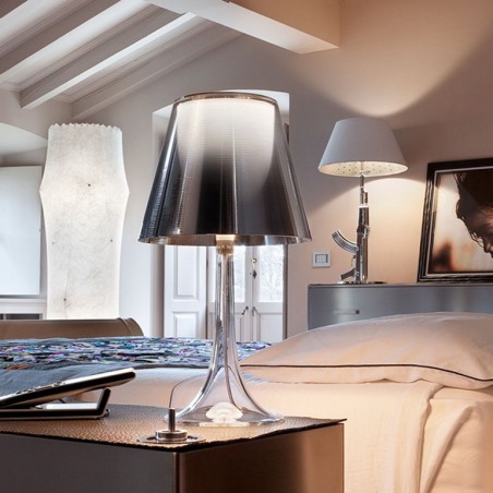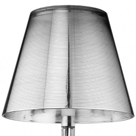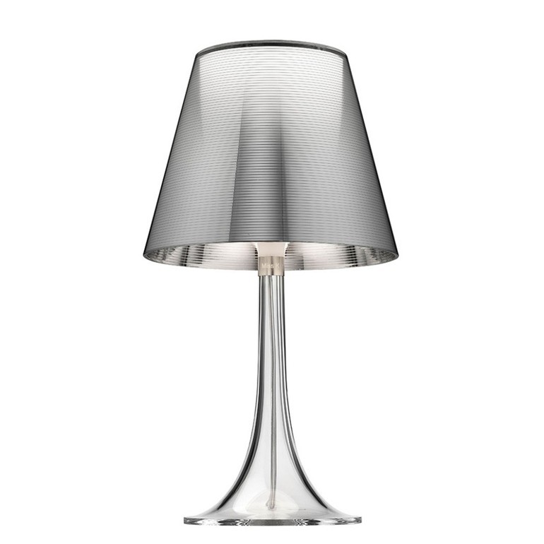 FLOS – Miss K è una lampada da tavolo a luce diffusa, disegnata da Philippe Starck. Miss K ha il corpo lampada in PMMA polimetilmetacrilato completamente trasparente stampato ad iniezione per le varianti con il paralume argento e tessuto, mentre trasparente in tinta per le varianti rosso e nero, il diffusore interno in policarbonato opalino stampato ad iniezione e il diffusore esterno, disponibile in quattro finiture, in policarbonato alluminato rosso, nero, argento o in tessuto. Le lampadine utilizzabili possono essere di tipo alogeno 70w o LED 8w con attacco E27, escluse. La funzione ON-OFF dell'apparecchio e la regolazione del flusso luminoso da 0 a 100% avvengono mediante un dimmer resistivo installato sul cavo di alimentazione.