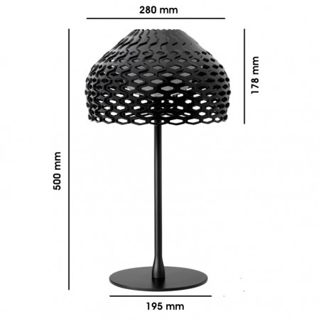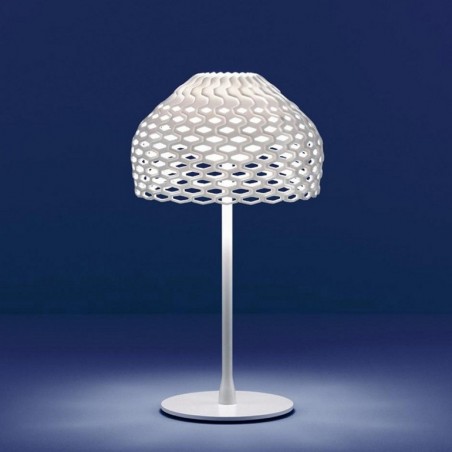 FLOS – Tatou T1 è una lampada da tavolo, a luce diffusa con la base e asta di sostegno in acciaio verniciato disponibile in tre colori: bianco, nero o grigio ocra. Il paralume esterno, che rappresenta la particolarità di questa lampada ed è prodotto in policarbonato con la tecnica della stampa ad iniezione, è caratterizzato da una particolare trama che ricorda un alveare o una rete lavorata a mano ed è nello stesso colore del resto della struttura. Un ulteriore diffusore interno, realizzato in policarbonato opale stampato ad iniezione, scherma e diffonde la luce. Le lampadine utilizzabili possono essere di tipo alogeno 70w o Led 8w con attacco E27, escluse. Tatou T1, disegnata da Patricia Urquiola, è perfetta per un ambiente elegante e lussuoso, un prodotto di design che lascia il segno, ideale per ambienti giorno come soggiorni e sale, ma perfetta anche per ambienti notte come camere da letto.