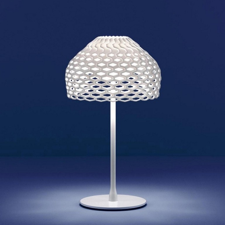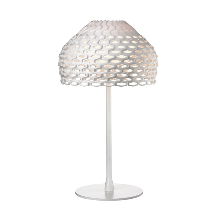 FLOS – Tatou T1 è una lampada da tavolo, a luce diffusa con la base e asta di sostegno in acciaio verniciato disponibile in tre colori: bianco, nero o grigio ocra. Il paralume esterno, che rappresenta la particolarità di questa lampada ed è prodotto in policarbonato con la tecnica della stampa ad iniezione, è caratterizzato da una particolare trama che ricorda un alveare o una rete lavorata a mano ed è nello stesso colore del resto della struttura. Un ulteriore diffusore interno, realizzato in policarbonato opale stampato ad iniezione, scherma e diffonde la luce. Le lampadine utilizzabili possono essere di tipo alogeno 70w o Led 8w con attacco E27, escluse.