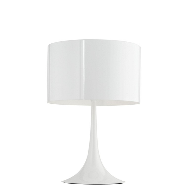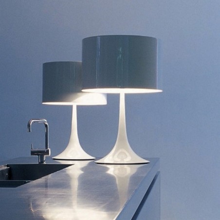 FLOS – Spun Light T1, design Sebastian Wrong, è una lampada da tavolo a luce diffusa con corpo e diffusore in metallo tornito in lastra, bracci supporto diffusore e supporto portalampada in lega d'alluminio pressofuso, tutti verniciati a liquido nei colori bianco, nero o Mud. Nella parte superiore del diffusore è presente uno schermo in vetro pressato con finitura sabbiata che nasconde alla vista la lampadina che può essere di tipo alogena da 105W o Led da 8w E27 escluse. Sul cavo è presente il dimmer che consente la regolazione a step dell'intensità luminosa