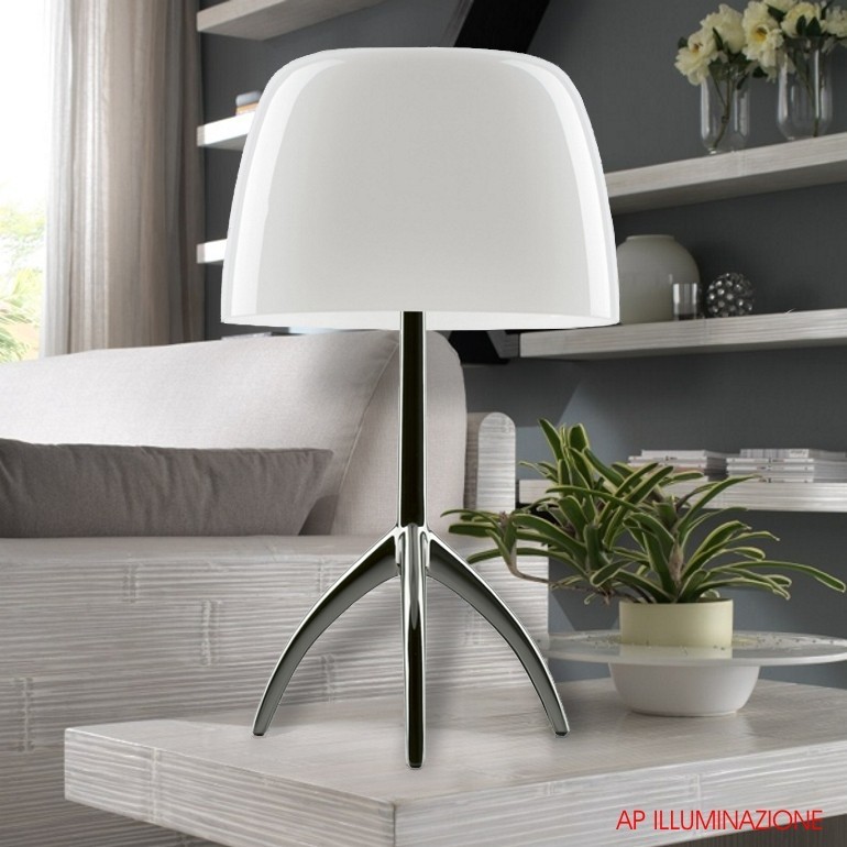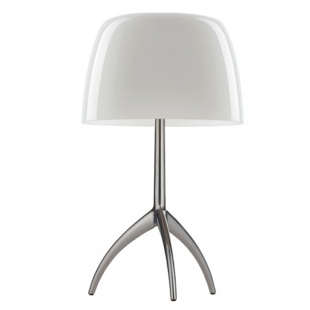 FOSCARINI- Lumiere tavolo grande, storia lampada del catalogo Foscarini disegnata da Rodolfo Dordoni, è caratterizzata dal particolare vetro soffiato, che durante gli anni ha spesso cambiato veste grafica, e dalla particolare e inconfondibile struttura a treppiedi che lo sorregge. Iconica e dal design unico e inimitabile, Lumiere viene proposta con quattro abbinamenti di colore per il diffusore e tre abbinamenti di colore per il fusto, oltre alla possibilità di dotarla con dimmer o semplice interruttore, dando così la possibilità a ognuno di interpretare e personalizzare la lampada a proprio gusto. Lumiere è fornita di due portalampada G9 che permettono di utilizzare sia lampadine alogene fino a 48w o Led escluse.