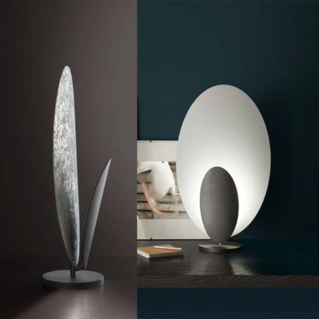 ICONE – Masai da appoggio, proposta in due dimensioni e diverse finiture colore è una lampada da tavolo caratterizzata da un design originale e molto scenografico, adatto ad arredare e rendere esclusivi gli ambienti dove la si intende collocare. Dotata di luce Led di potenze differenti a secondo della dimensione. Masai LP è dotata di una sorgente led da 15W 1350lm 3000°K che si riflette sulla grande foglia, mentre Masai LG è dotata di una sorgente Led da 20W 1920lm 3000°K sempre che si riflette sulla grande foglia .
