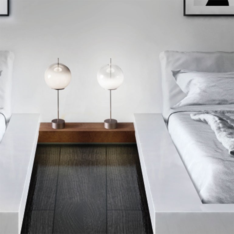 ICONE - Bolla tavolo è una lampada realizzata in alluminio verniciato e vetri soffiati sfumati trasparenti o filigrana. La lampada Bolla tavolo è dotata di LED 7,5w 24v 850lm 3000°K dimmerabile.