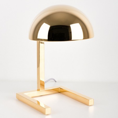 LUMEN CENTER – MJA lampada da tavolo disegnata nel 1930 da Jacques Adnet esponente di spicco del Modernismo francese e, in quegli anni, direttore de “La Compagnie des Arts Francais” in cui operarono Francois Jourdain, Charlotte Perriand e Georges Jouve. MJA (Memory of Jacques Adnet) entrò in produzione solo nel 2005; in precedenza non fu mai realizzata se non a livello di prototipo. La lampada, composta da una calotta sferica poggiata su un piedistallo dalla forma quadrangolare, è realizzata in ottone con due finiture. Attacco universale E14 adatto all’uso di lampadina Led non inclusa