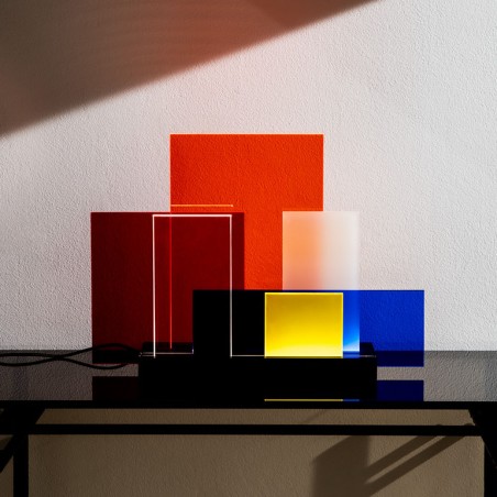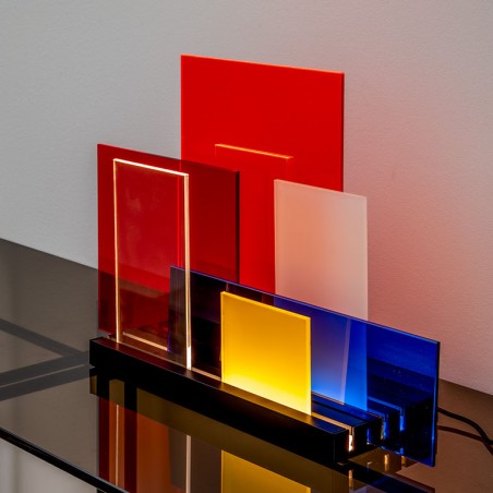 NEMO - On Lines, lampada da tavolo a LED con base in alluminio e pannelli diffusori in metacrilato. La base presenta 4 binari dove posizionare liberamente i differenti diffusori per creare infinite configurazioni di luce e trasparenze. Disponibile in due versioni, base verniciata bianca e diffusori colorati e base verniciata nera con diffusori neutri ed uno rosso. Dimmerabile con interruttore touch dimmer on board.