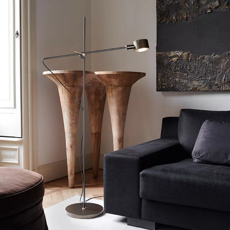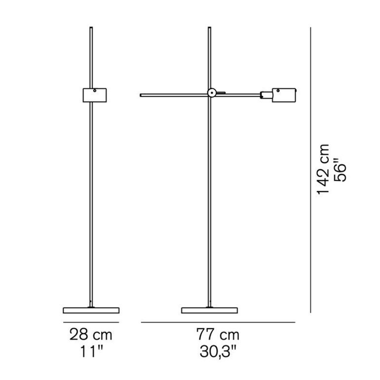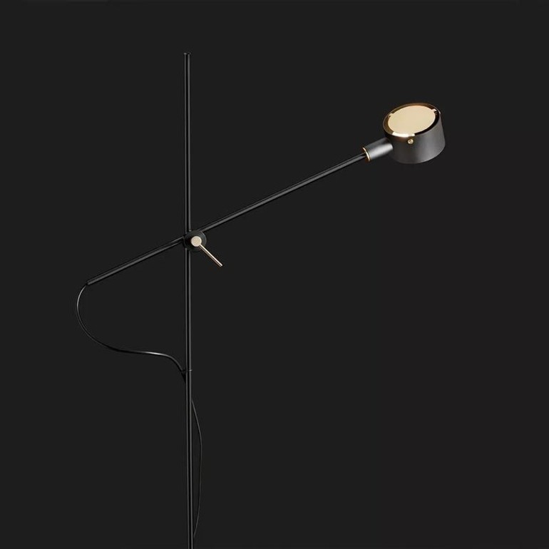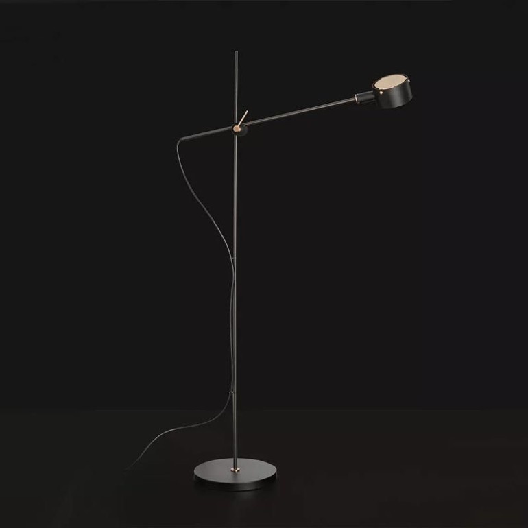 OLUCE - G.O. è una lampada da terra in metallo verniciato a luce diretta, asta a riflettore orientabili e regolabili. Base e riflettore disponibili in più varianti G.O è dotata di portalampada E14 e interruttore on-off.