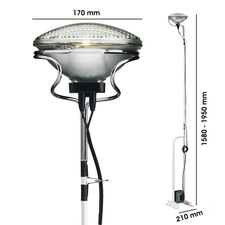 FLOS – Toio Led è una storica lampada da terra disegnata dai fratelli Achille e Pier Giacomo Castiglioni che è caratterizzata da una base di acciaio tranciato e piegato e da una struttura in profilati d'acciaio, entrambi verniciati a liquido nelle finiture bianco, nero o rosso. L'asta che consente il movimento telescopico e permette la regolazione dell'altezza dell'apparecchio e in acciaio esagonale con finitura cromo. Sul cavo è presente il dimmer che consente la regolazione dell'intensità luminosa fornita da una lampadina Led da 23w 2500°K 1500lm PAR 56 inclusa nella confezione.