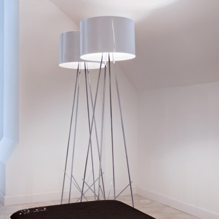 FLOS – Ray F2, design Rodolfo Dordoni, è un apparecchio di illuminazione da terra a luce diffusa con struttura in tubolare di acciaio cromato e diffusore interno in policarbonato stampato ad iniezione di colore opalino. Il diffusore esterno, in alluminio tornito in lastra e verniciato all’interno di colore bianco, può essere a scelta in colore bianco lucido, nero lucido, oppure in vetro grigio incamiciato e soffiato a bocca con finitura esterna lucida. Sul cavo è presente il dimmer elettronico, che consente la regolazione a step dell’intensità luminosa. Le lampadine utilizzabili possono essere di tipo alogeno da 250w o a Led da 21w escluse.
