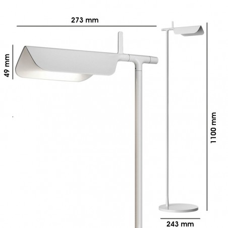 FLOS - Tab F, alta solo 110 cm, è una lampada da lettura a luce diretta, adatta per essere utilizzata al fianco di un divano o poltrona. Dotata di una testa orientabile sull'asse verticale di circa 60° con scheda multi-led, per la precisione 14, che danno un totale di 9w, schermati da un diffusore in PMMA studiato appositamente per evitare l'effetto Multi Shadow e l'abbagliamento. Il corpo in alluminio pressofuso può essere a scelta verniciato bianco o nero.
