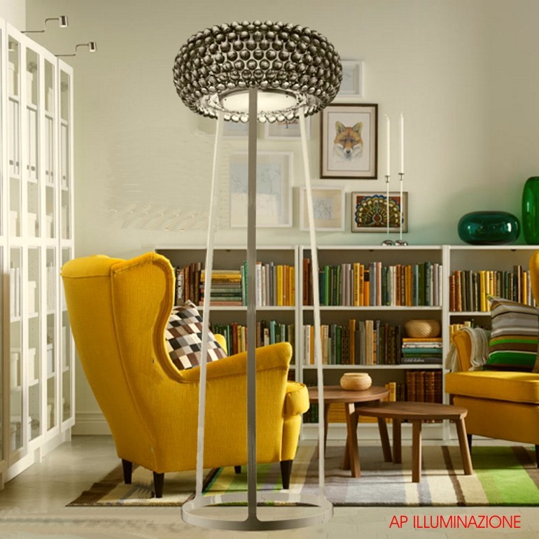 FOSCARINI- Caboche grande da terra, caratterizzata da un struttura in alluminio verniciato e da un diffusore realizzato con sfere in PMMA trasparente, è una lampada dal design particolare, adatto sia per ambienti classici che moderni. Dotata di sorgente Led da 28w Led 2700°K regolabile grazie a un dimmer posto sul cavo. Lampada particolarmente adatta per saloni, soggiorni moderni e camera da letto di design.