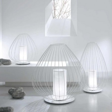 KARMAN – Cell, adatta sia per un uso esterno che interno, emula la struttura e lo spirito di una lanterna cinese sotto forma di lampade da terra: una romantica gabbia di luce realizzata con un sottile filo metallico bianco o bronzo a tenuta stagna. Il paralume è un cuore luminoso di plexiglass opalescente. Disponibile in tre dimensioni, in tutte è presente un portalampada E27 che permette l'utilizzo di lampadine led. Adatta sia per uso indoor che outdoor avendo un grado di protezione IP65.