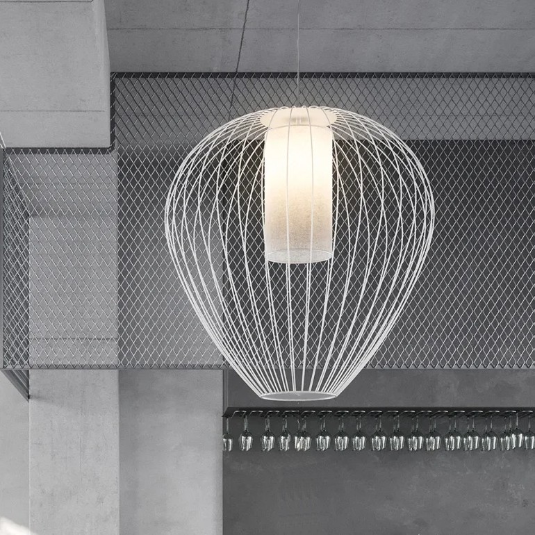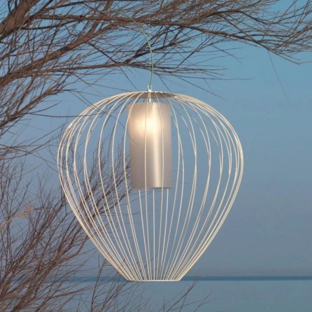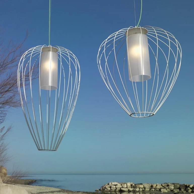 KARMAN – Cell, adatta sia per uso esterno che interno, emula la struttura e lo spirito di una lanterna cinese sotto forma di lampade a sospensione: una romantica gabbia di luce realizzata con un sottile filo metallico bianco o bronzo a tenuta stagna. Il paralume è un cuore luminoso di plexiglass opalescente. Fornita con rosone, adatto anche per uso esterno, la lampada è disponibile in tre dimensioni e in tutte è presente un portalampada E27 che permette l'utilizzo di lampadine led.