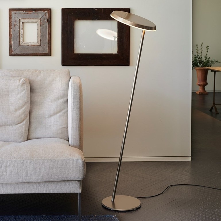 OLUCE - Amanita disegnata da Mariana Pellegrino Soto nasce come una lampada da lettura composta da due dischi: il primo, più sottile, a fungere da base, il secondo, più spesso, accoglie la fonte luminosa LED da 18W dimmerabile. I due cerchi metallici sono collegati e distanziati da un tige obliquo e sottile a formare una sorta di ‘Z’.