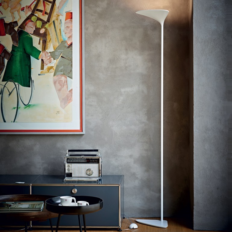 ROTALIANA - Sunset F1 è una lampada da terra dove all'aspetto emozionale si collega quello funzionale: la testa curva della lampada infatti è stata concepita per sfruttare al meglio la riflessione della luce sulle pareti. La sorgente luminosa, fornita da un Led da 34w può essere a scelta con temperatura colore 2700°K o 3000°K e una resa di 3400lm che si diffonde nell'ambiente in modo indiretto e riflesso, con la possibilità di dosarne l'intensità a secondo della necessità. Un design discreto adattabile a qualunque ambiente sia classico che moderno. o contemporaneo.