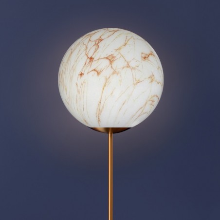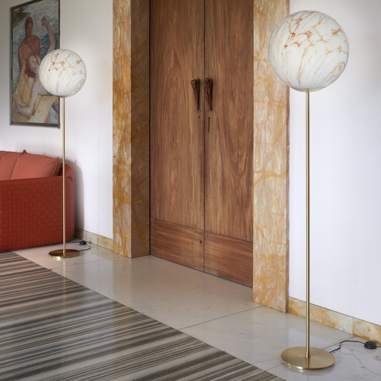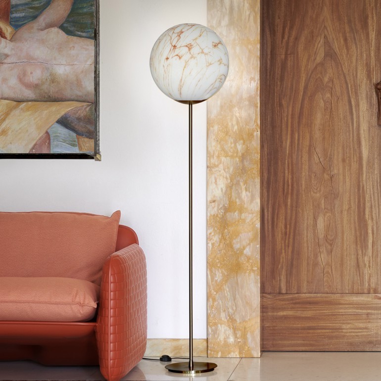 SLIDE - Mineral Stand, una lampada da terra che richiama le lussuose finiture del marmo, con venature grigie oppure rosse. Mineral, con la sua luce soffusa e delicata, grazie alla sua texture marmorea, è ideale per accogliere i propri ospiti in un ambiente elegante e caldo al tempo stesso. La base metallica e lo stelo in color ottone satinato donano una finitura curata nei minimi dettagli all’intera lampada. Disponibile in un unica dimensione dimensione, la lampadine utilizzabile, ma non inclusa, è da 25W E27.