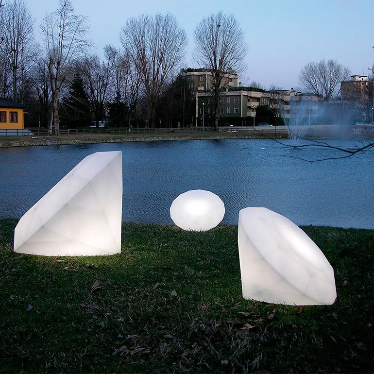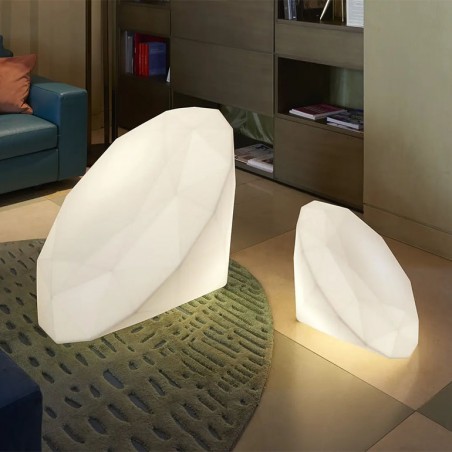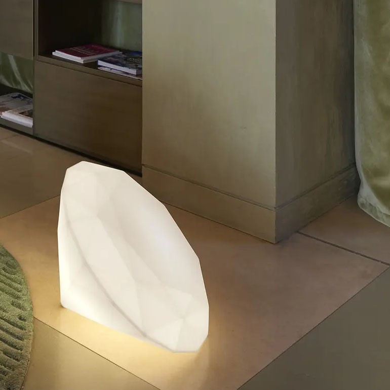 SLIDE - Bijoux è una lampada decorativa in polietilene che ricorda la forma di un diamante: la luce diffusa che emana lo rende un brillante che impreziosisce gli indoor e gli outdoor di contract e privati.‎ Realizzato in polietilene con la tecnica dello stampaggio rotazionale Bijoux e dotata di un portalampada E27 che permette l'utilizzo di lampadine Led.‎ Bijoux è un elemento decorativo e luminoso disponibile in due diverse dimensioni.‎ Una romantica lampada da terra che diventa un oggetto ideale per arredare