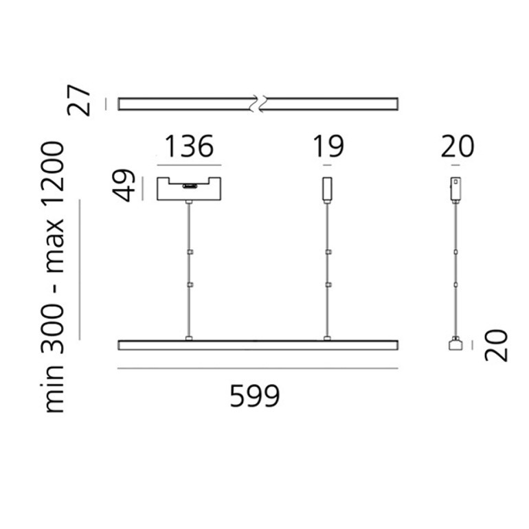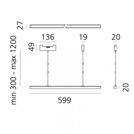 - Diffondente Linear 600 sospensione - L599 P27 H20 mm. - Sporgenza min. 300 mm. max 1200 mm.